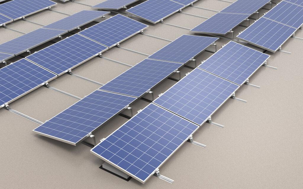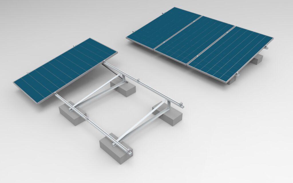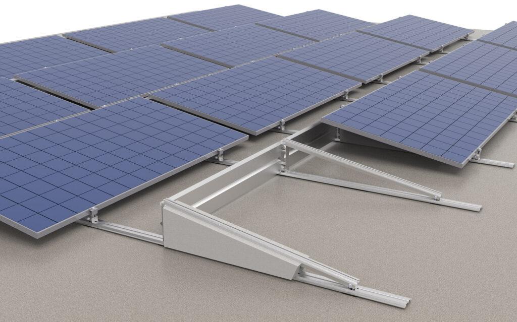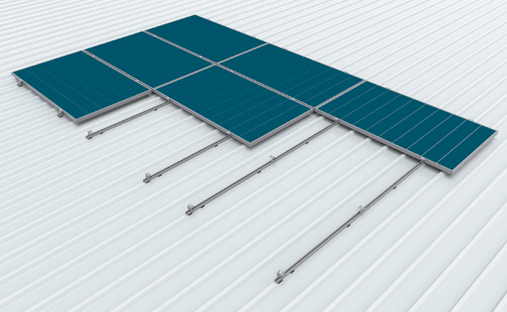 This system uses shared aluminum supports, at the angle requested by the customer, to hold a row or grid of PV modules. The modules are attached to the profiles using central and lateral fastening components and are mounted horizontally or in landscape orientation.